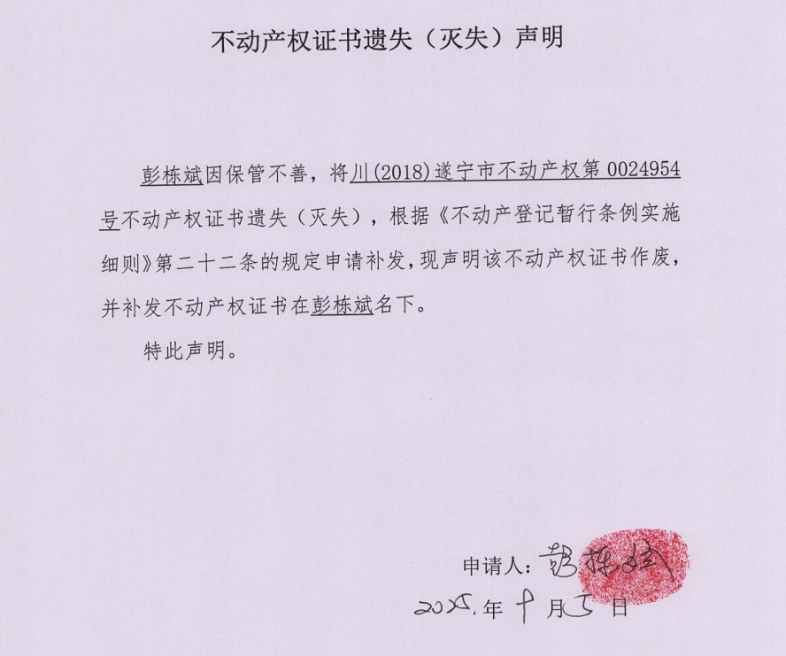不动产权证书遗失(灭失)声明(彭栋斌)