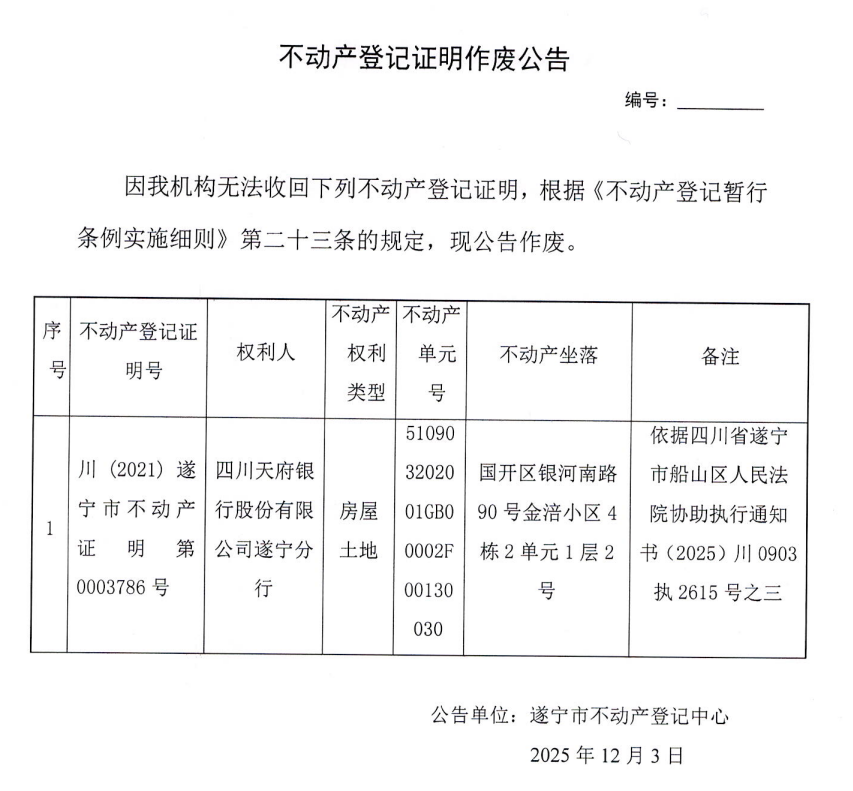 不动产登记证明作废公告(四川天府银行股份有限公司遂宁分行)