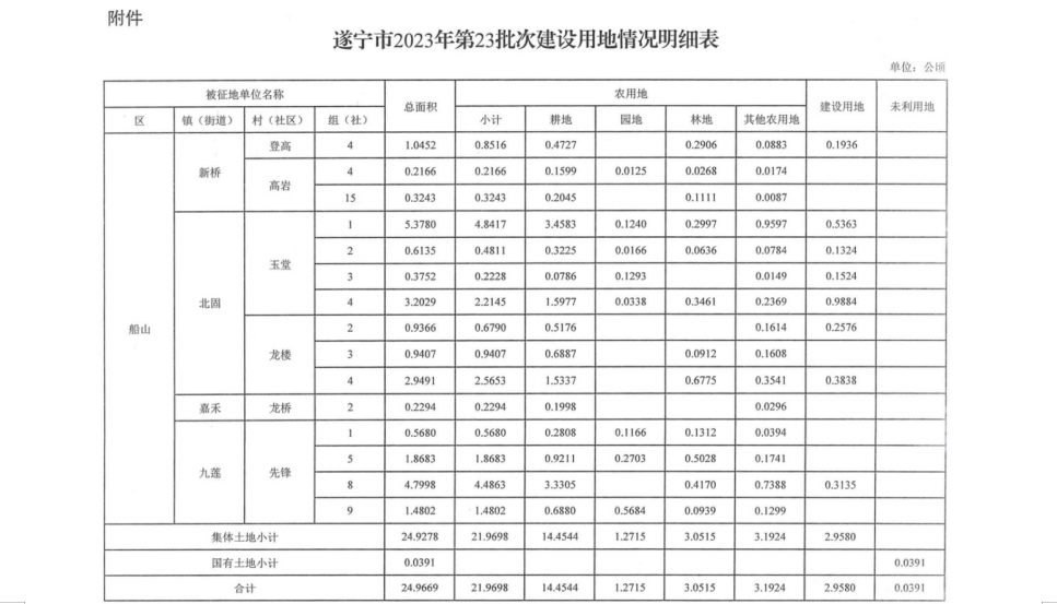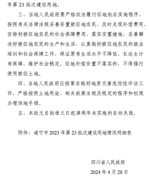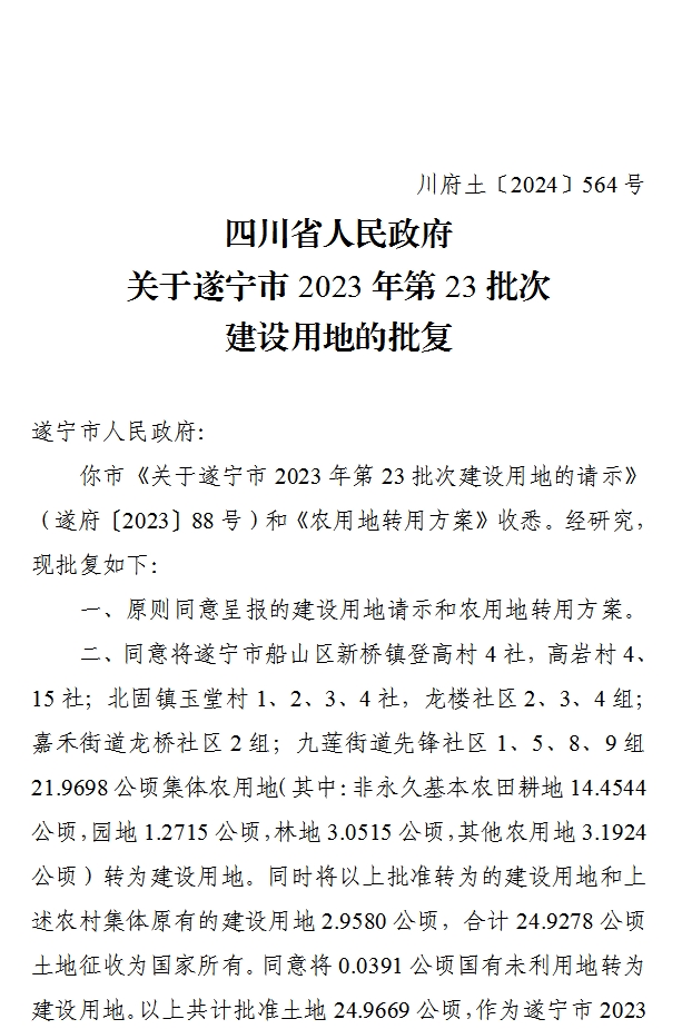 四川省人民政府关于遂宁市2023年第23批次建设用地的批复(川府土〔2024〕564号)