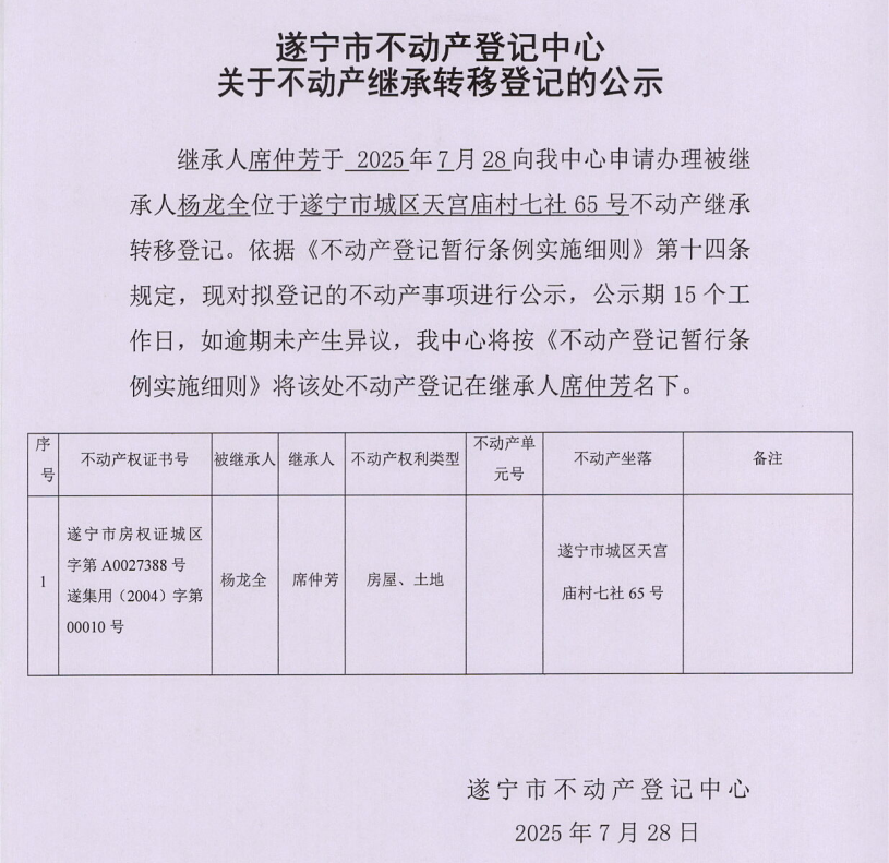 遂宁市不动产登记中心关于不动产继承转移登记的公示(席仲芳)