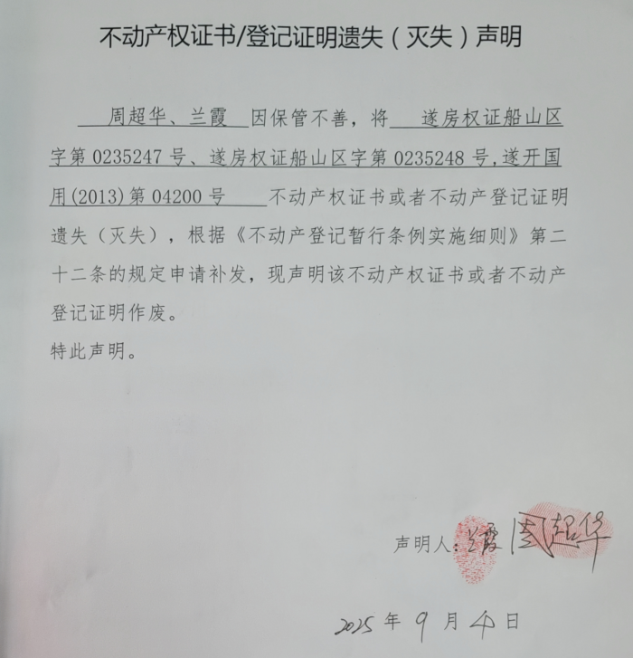 不动产权证书/登记证明遗失(灭失)声明(周超华、兰霞)