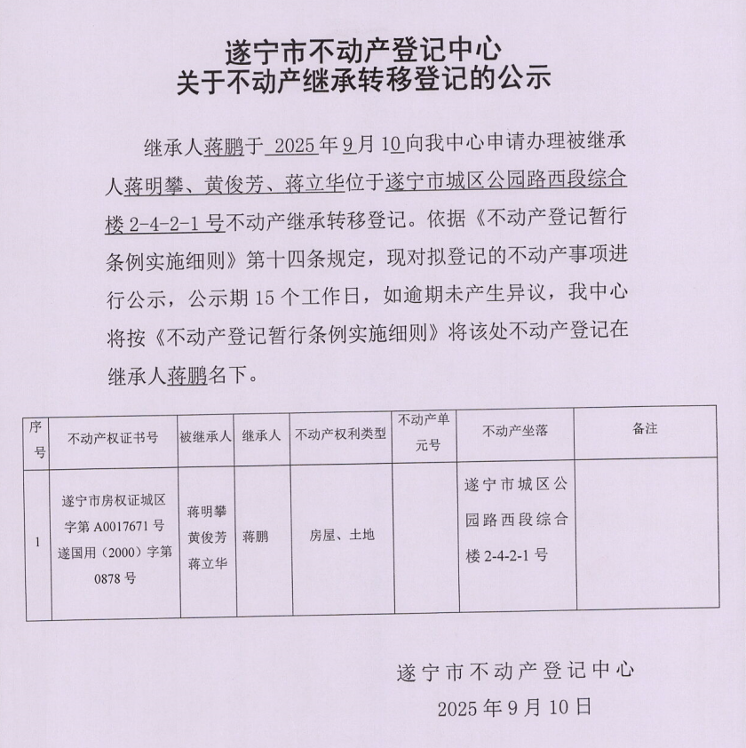 遂宁市不动产登记中心关于不动产继承转移登记的公示(蒋鹏)