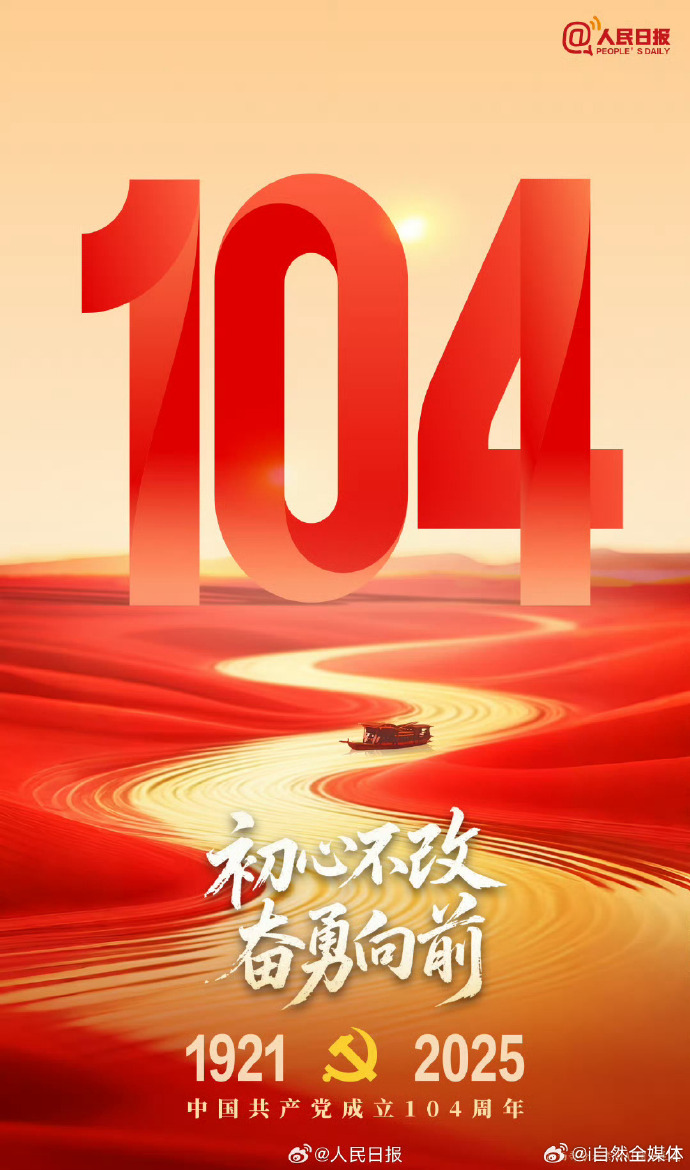 104年,历经风雨洗礼,初心不改;新征程上,向着新目标,奋楫再出发。今天,祝福党,祝福祖国!
