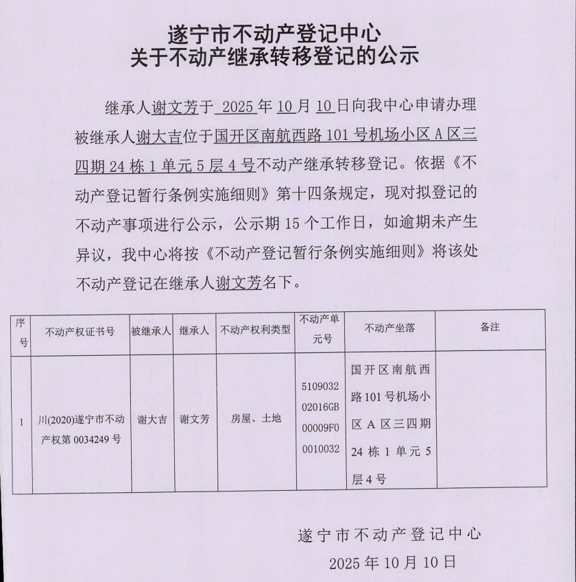遂宁市不动产登记中心关于不动产继承转移登记的公示(谢文芳)