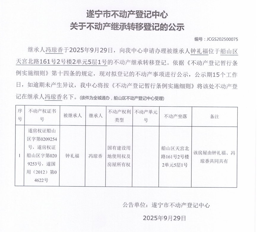 遂宁市不动产登记中心关于不动产继承转移登记的公示(冯琼香)