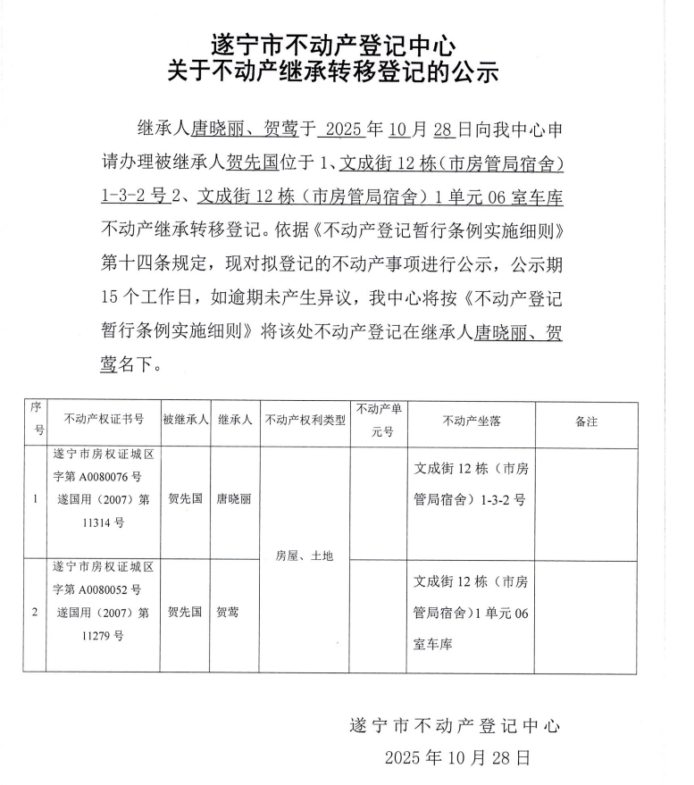遂宁市不动产登记中心关于不动产继承转移登记的公示(唐晓丽、贺莺)