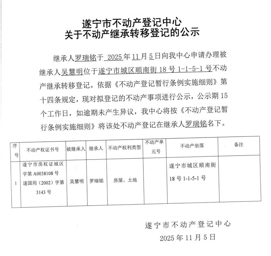 遂宁市不动产登记中心关于不动产继承转移登记的公示(罗瑞铭)