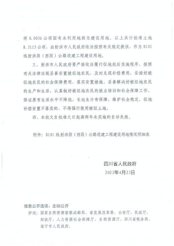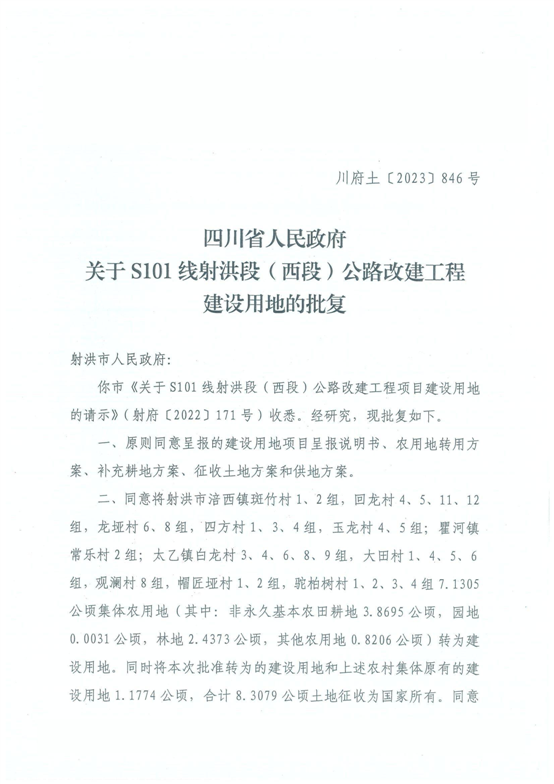 四川省人民政府关于S101线射洪段(西段)公路改建工程建设用地的批复(川府土〔2023〕 846号)