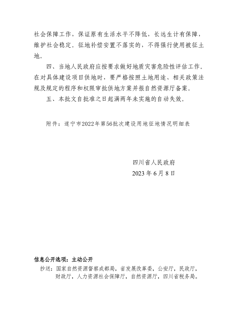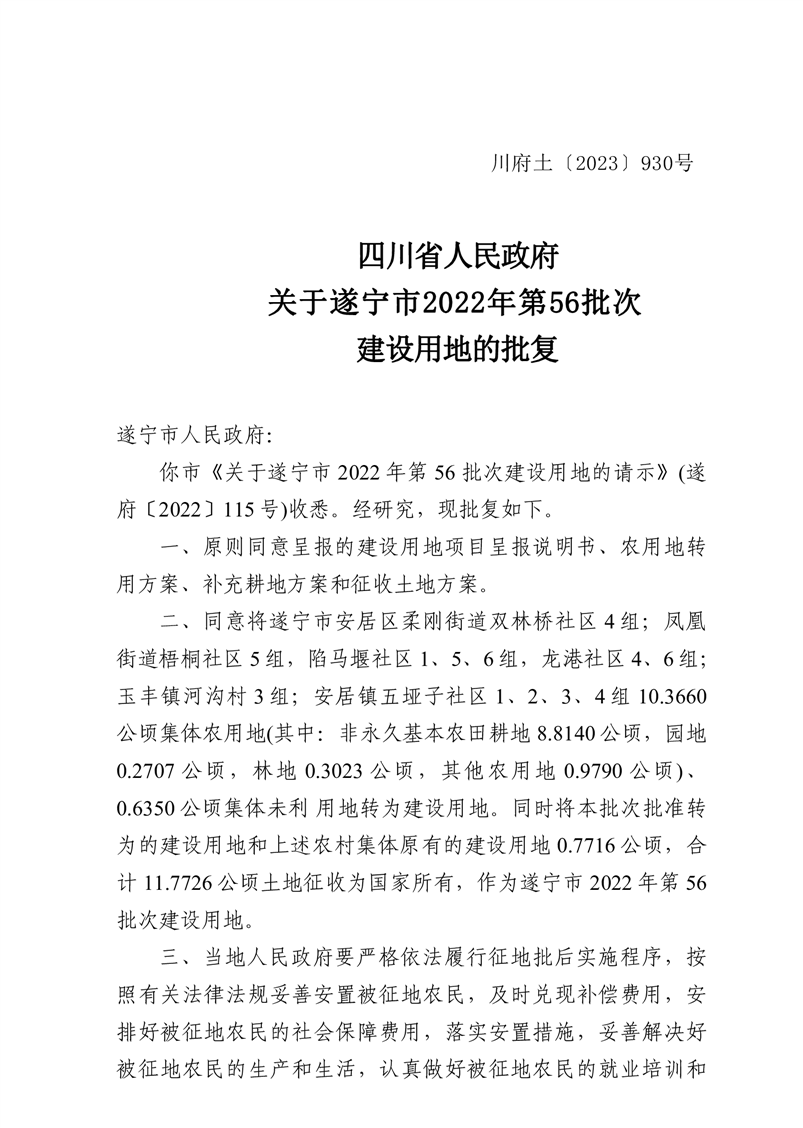 四川省人民政府关于遂宁市2022年第56批次建设用地的批复(川府土〔2023〕930号 )