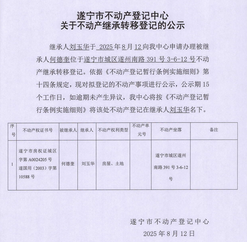 遂宁市不动产登记中心关于不动产继承转移登记的公示(刘玉华)