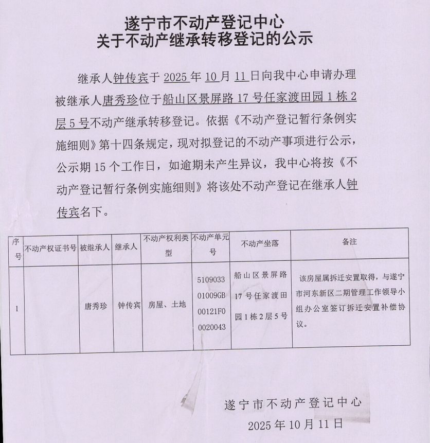 遂宁市不动产登记中心关于不动产继承转移登记的公示(钟传宾)
