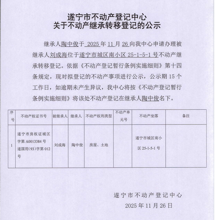 遂宁市不动产登记中心关于不动产继承转移登记的公示(陶中俊)