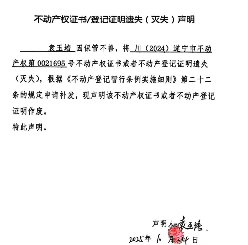 不动产权证书/登记证明遗失(灭失)声明(袁玉培)