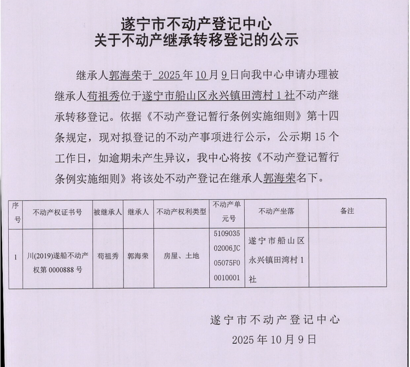 遂宁市不动产登记中心关于不动产继承转移登记的公示(郭海荣)