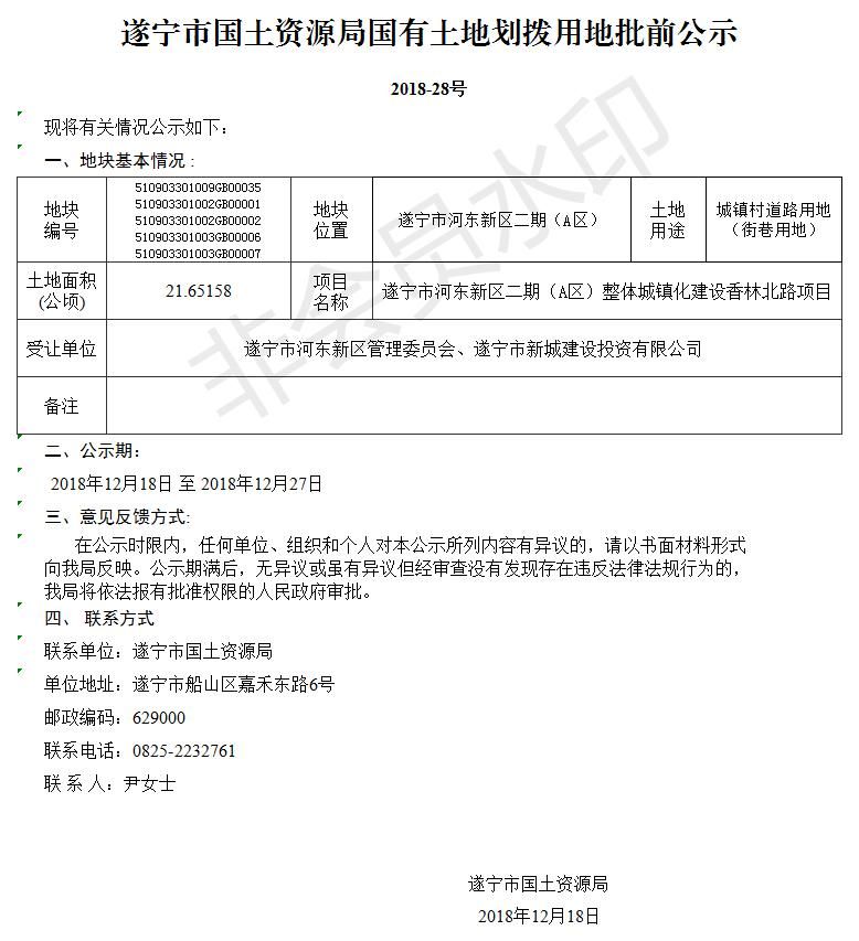 遂宁市国土资源局国有土地划拨用地批前公示(2018-28号)
