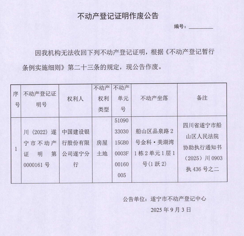不动产登记证明作废公告(中国建设银行股份有限公司遂宁分行)
