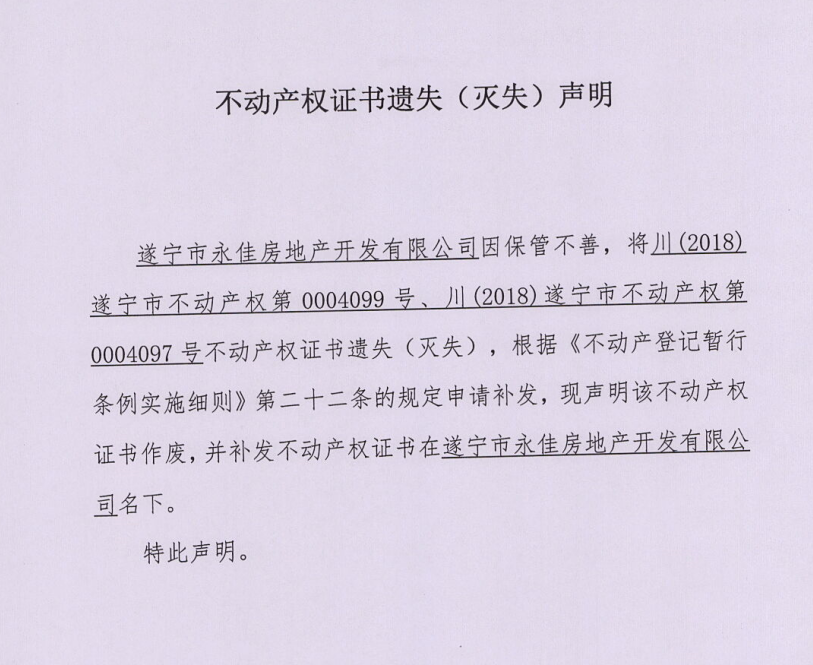 不动产权证书遗失(灭失)声明(遂宁市永佳房地产开发有限公司)
