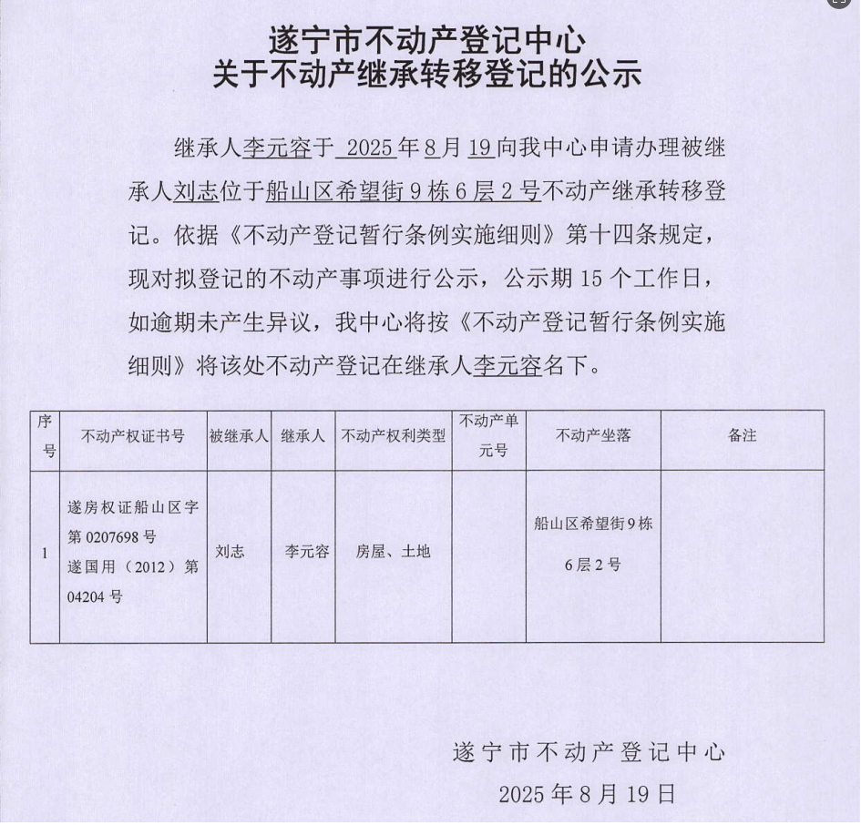 遂宁市不动产登记中心关于不动产继承转移登记的公示(李元容)