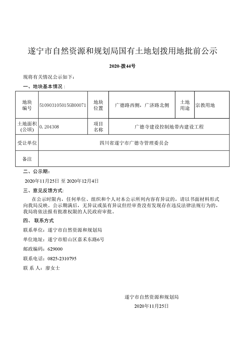 遂宁市自然资源和规划局国有土地划拨用地批前公示2020-拨44号