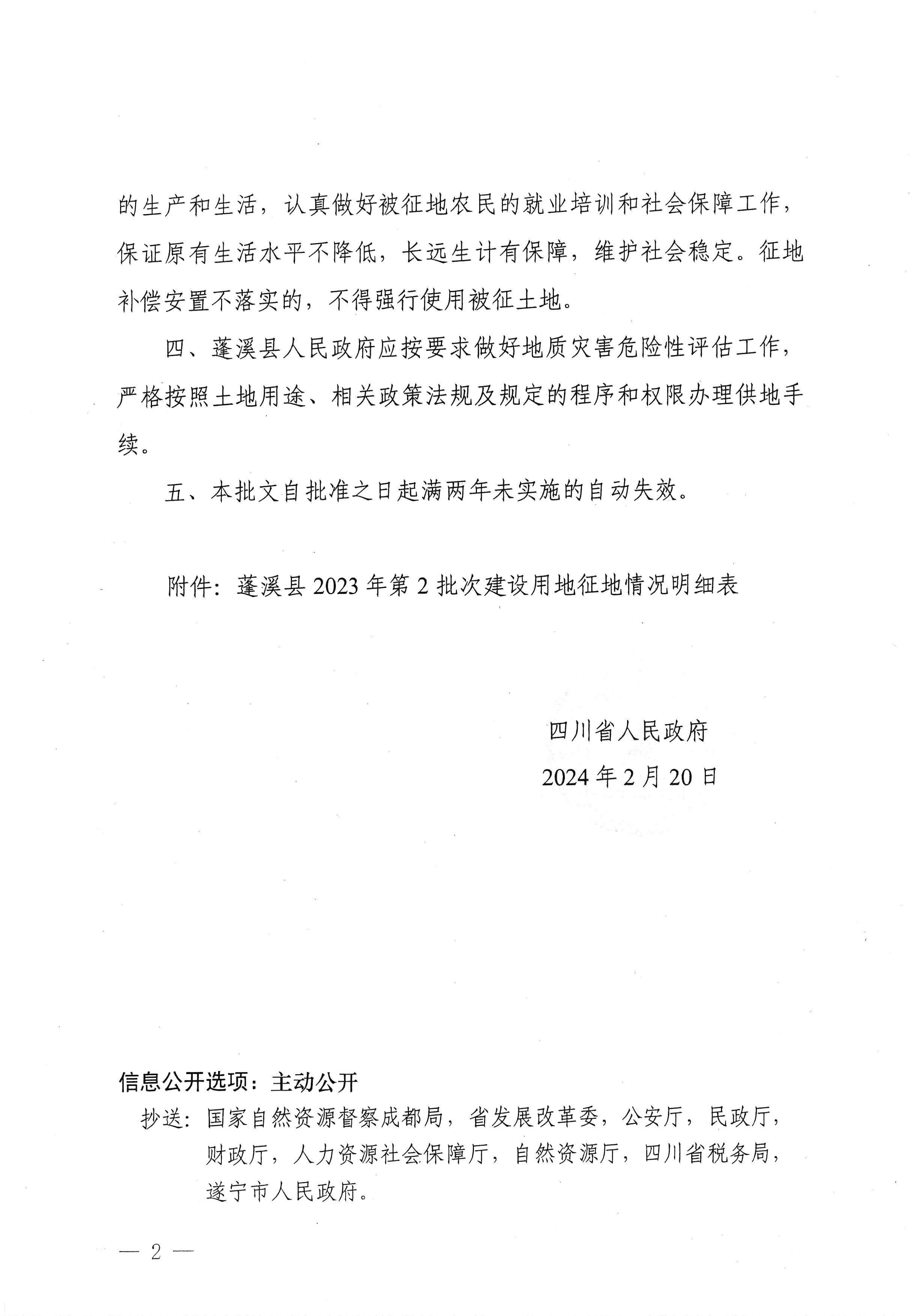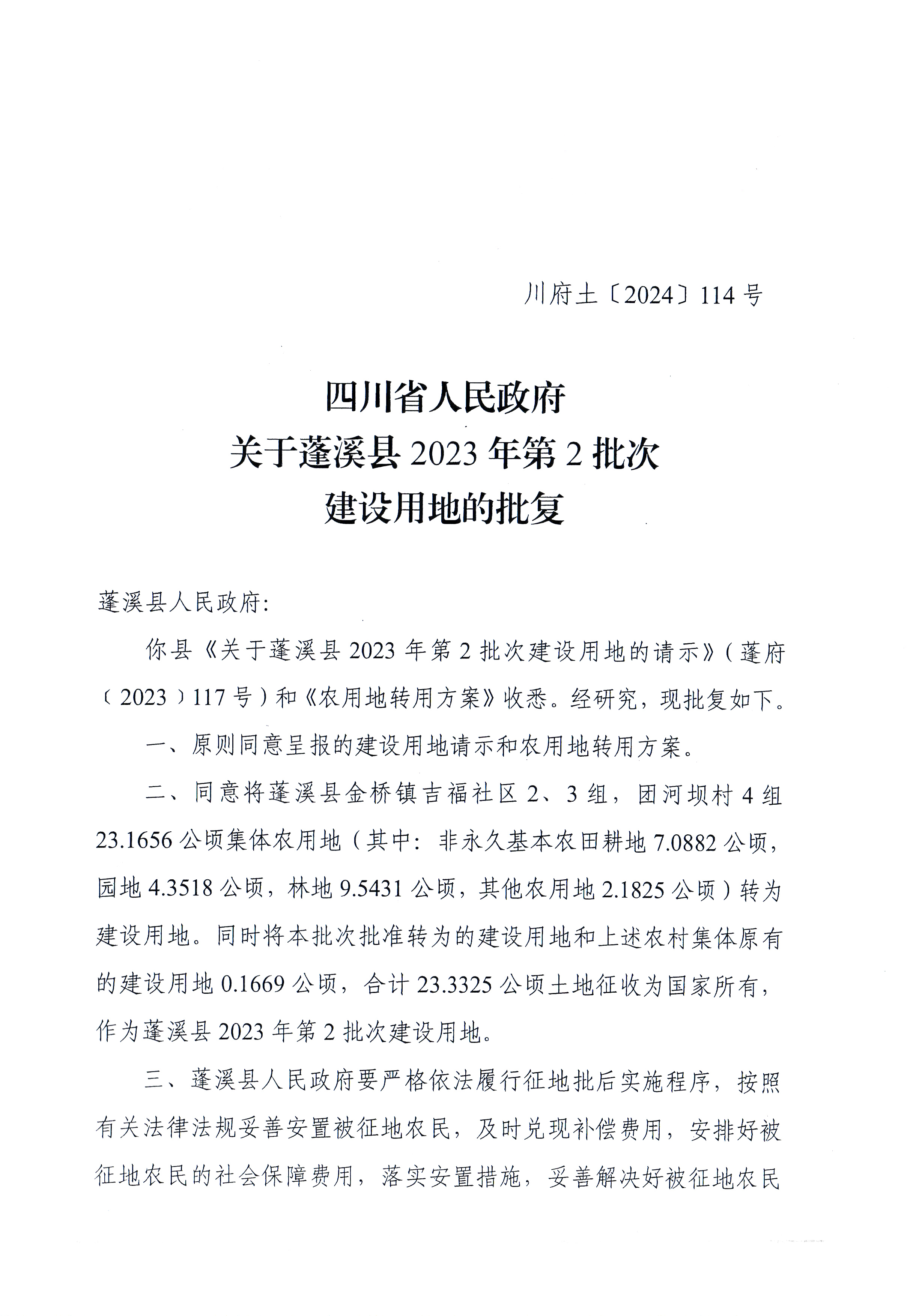 四川省人民政府关于蓬溪县2023年第2批次建设用地的批复(川府土〔2024〕114号)