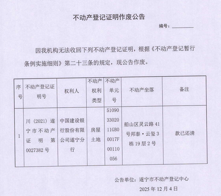 不动产登记证明作废公告(中国建设银行股份有限公司遂宁分行)