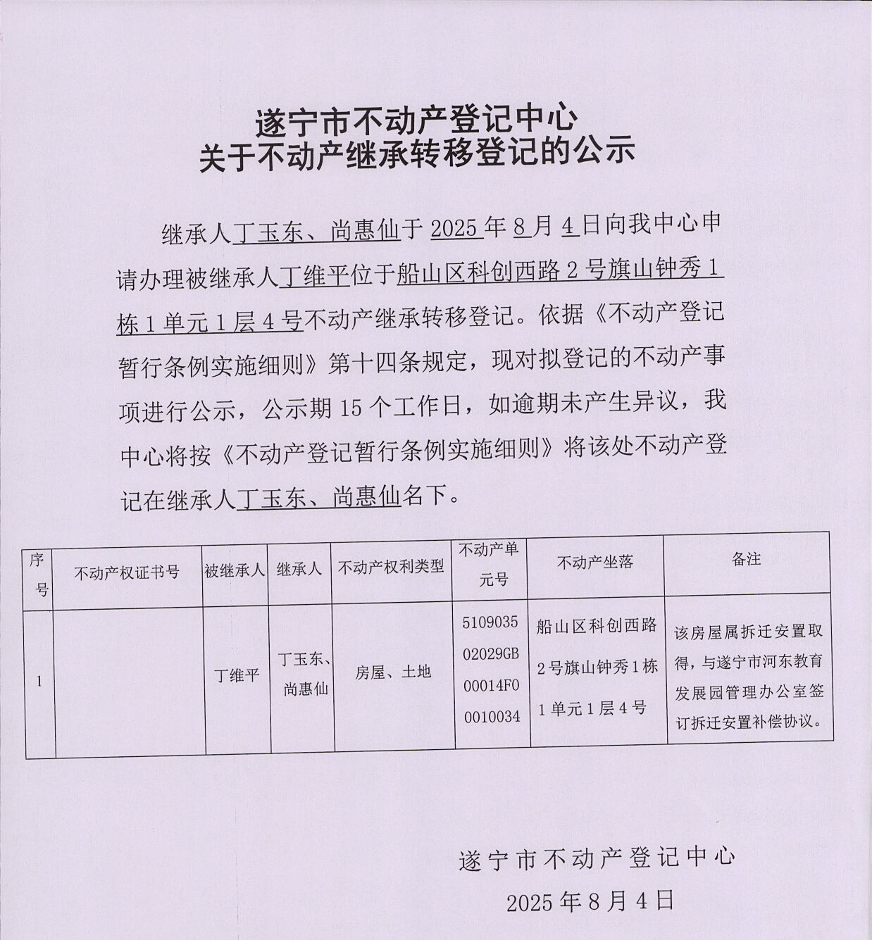 遂宁市不动产登记中心关于不动产继承转移登记的公示(丁玉东、尚惠仙)