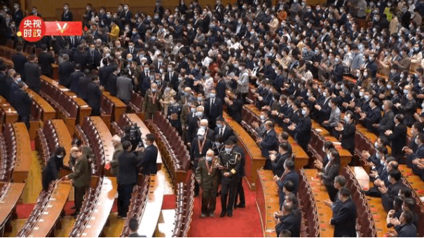 大会现场,志愿军老战士入场,现场全体起立,向老英雄致敬!