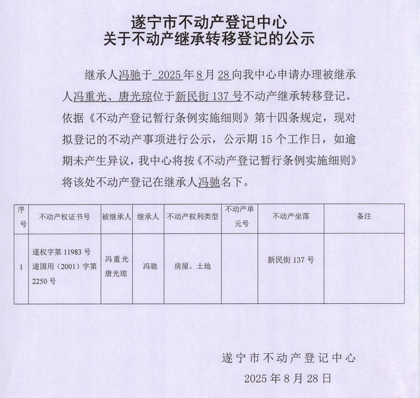 遂宁市不动产登记中心关于不动产继承转移登记的公示(冯驰)