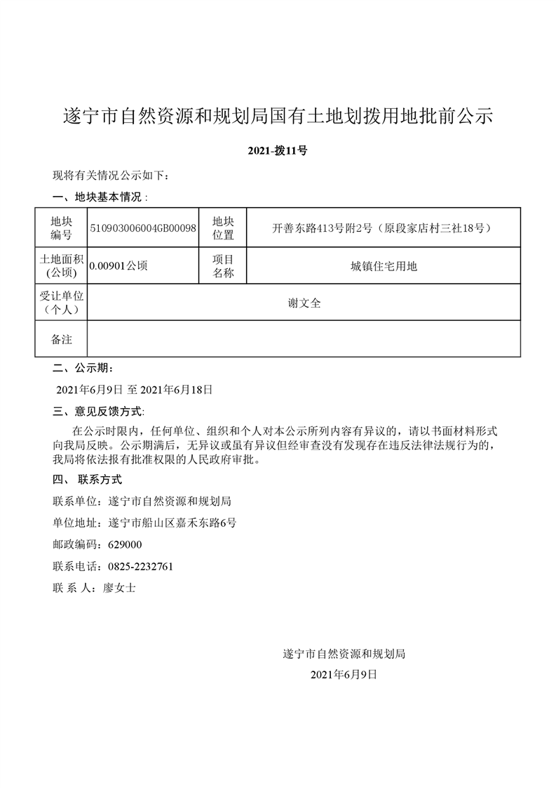 遂宁市自然资源和规划局国有土地划拨用地批前公示2021-拨11号
