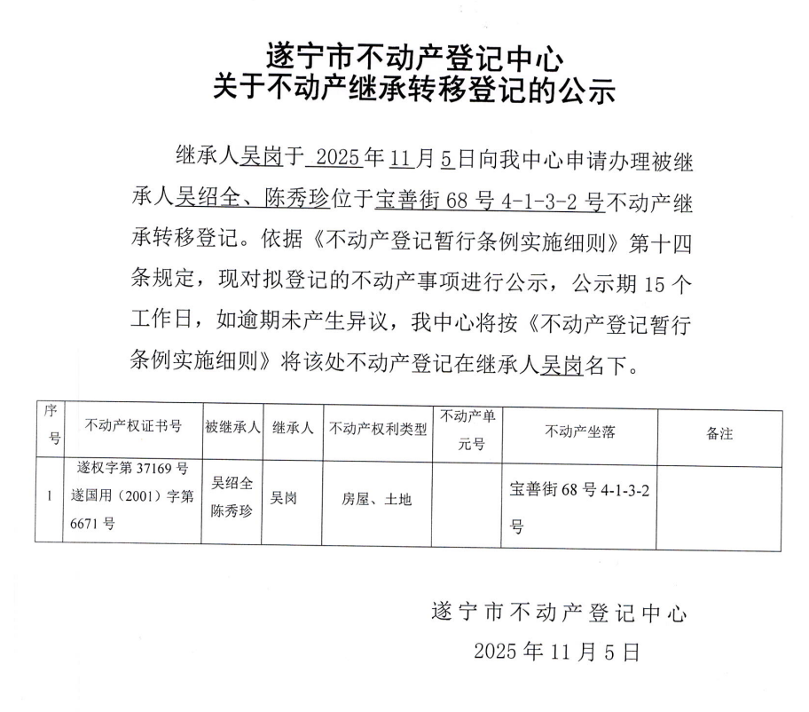 遂宁市不动产登记中心关于不动产继承转移登记的公示(吴岗)