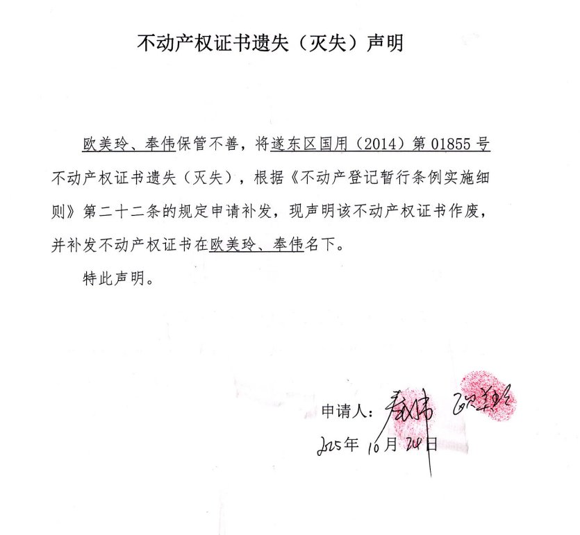 不动产权证书遗失(灭失)声明(欧美玲、奉伟)