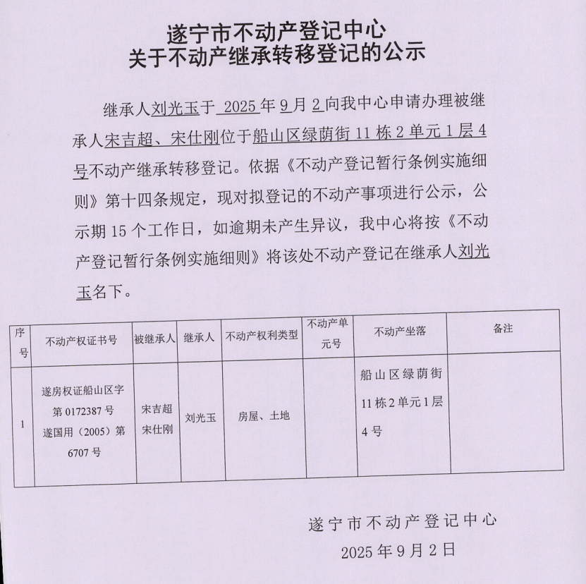 遂宁市不动产登记中心关于不动产继承转移登记的公示(刘光玉)