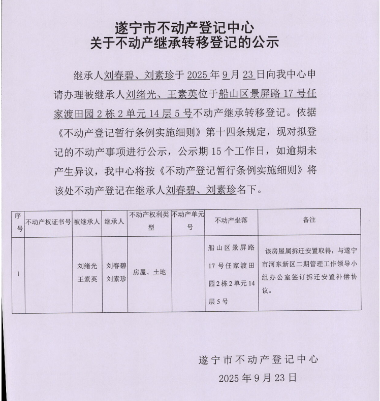 遂宁市不动产登记中心关于不动产继承转移登记的公示(刘春碧、刘素珍)