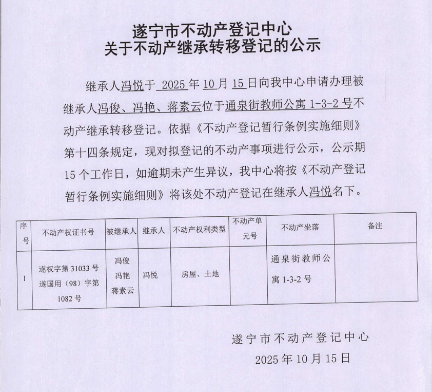 遂宁市不动产登记中心关于不动产继承转移登记的公示(冯悦)