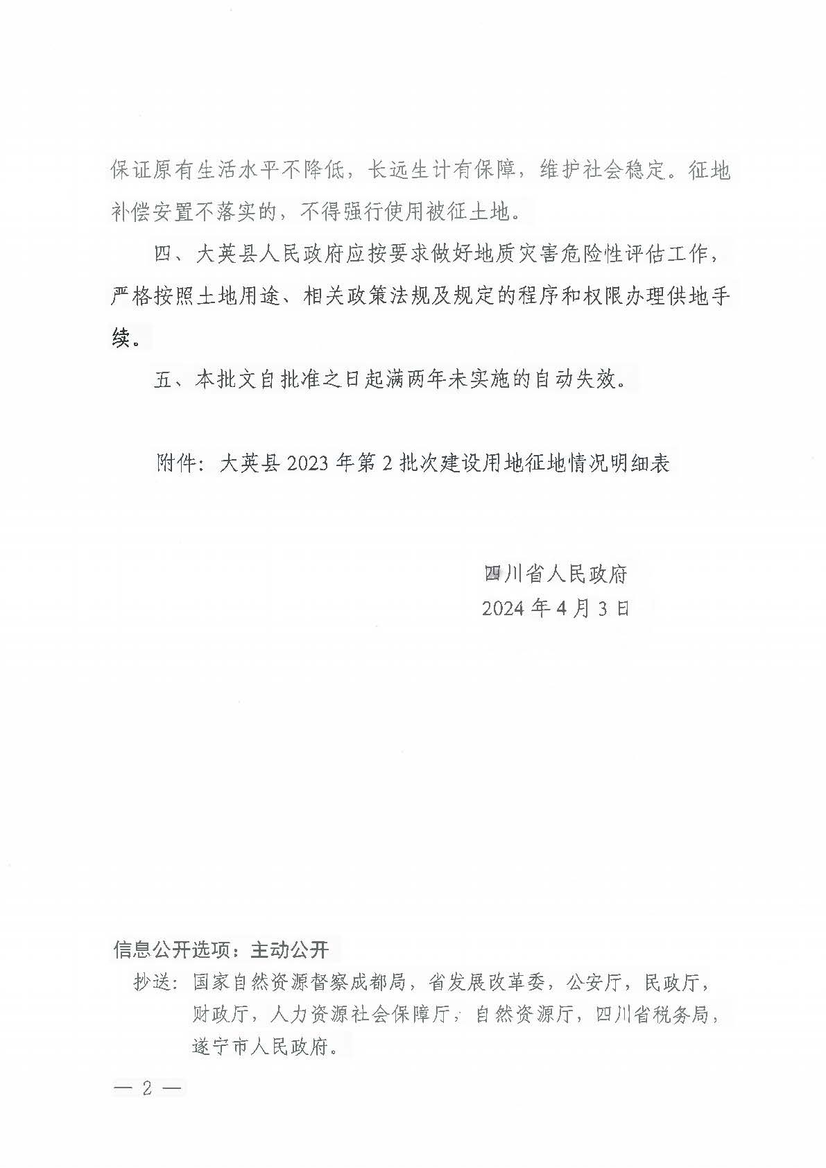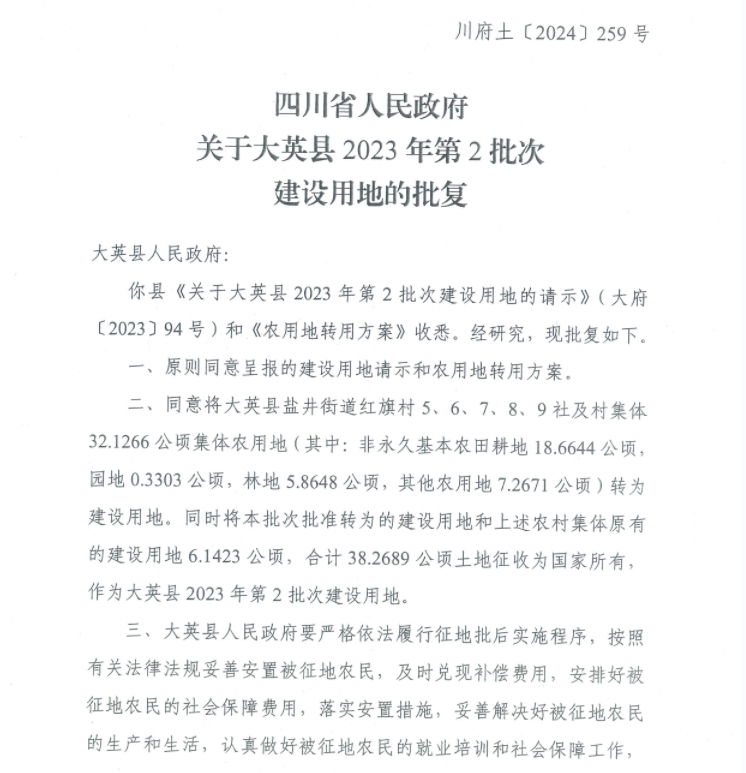 四川省人民政府关于大英县2023年第2批次建设用地的批复(川府土〔2024〕259号)
