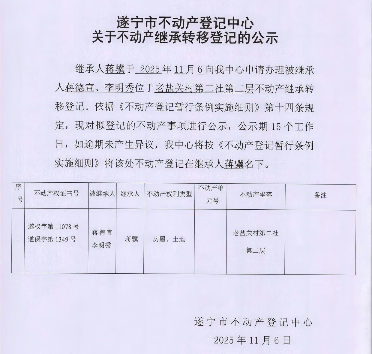 遂宁市不动产登记中心关于不动产继承转移登记的公示(蒋骥)