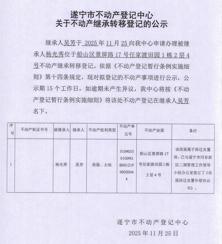 遂宁市不动产登记中心关于不动产继承转移登记的公示(吴芳)