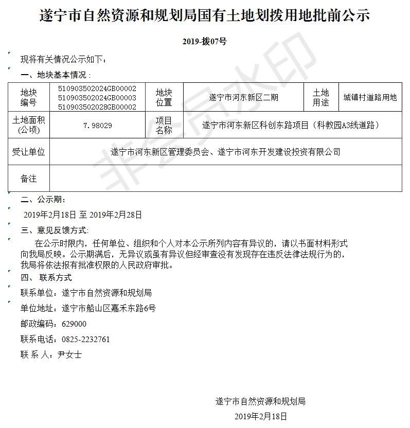 遂宁市自然资源和规划局国有土地划拨用地批前公示(2019-拨07号)