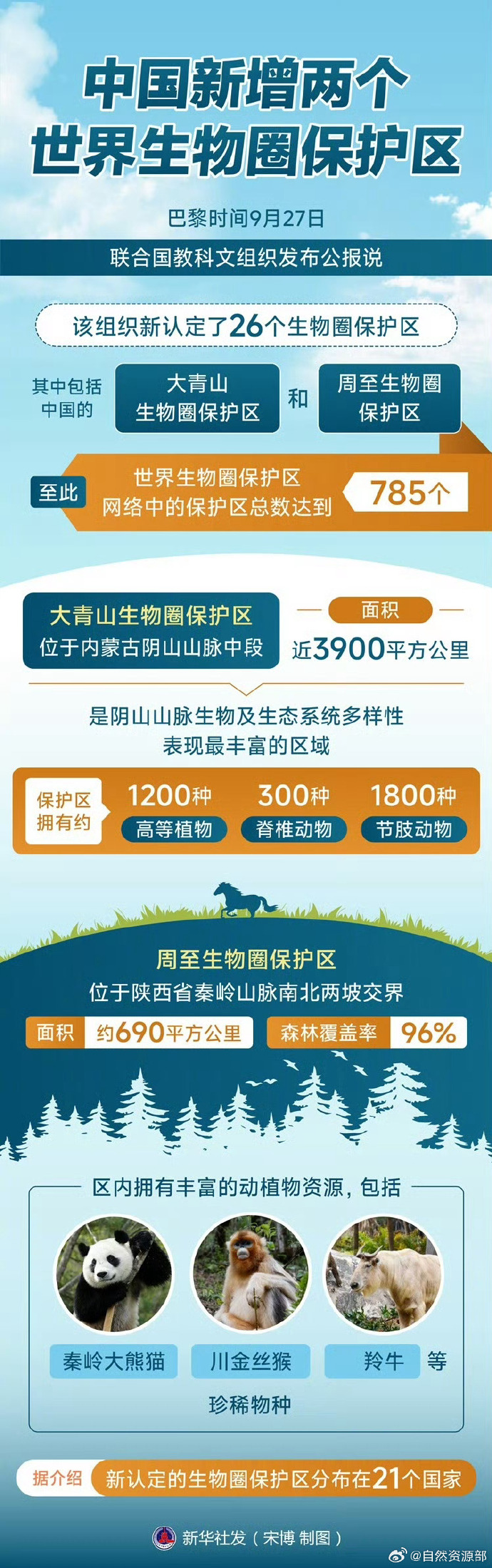 联合国教科文组织认定了26个生物圈保护区,其中包括中国的大青山生物圈保护区和周至生物圈保护区。至此,世界生物圈保护区网络中的保护区总数达到785个。
