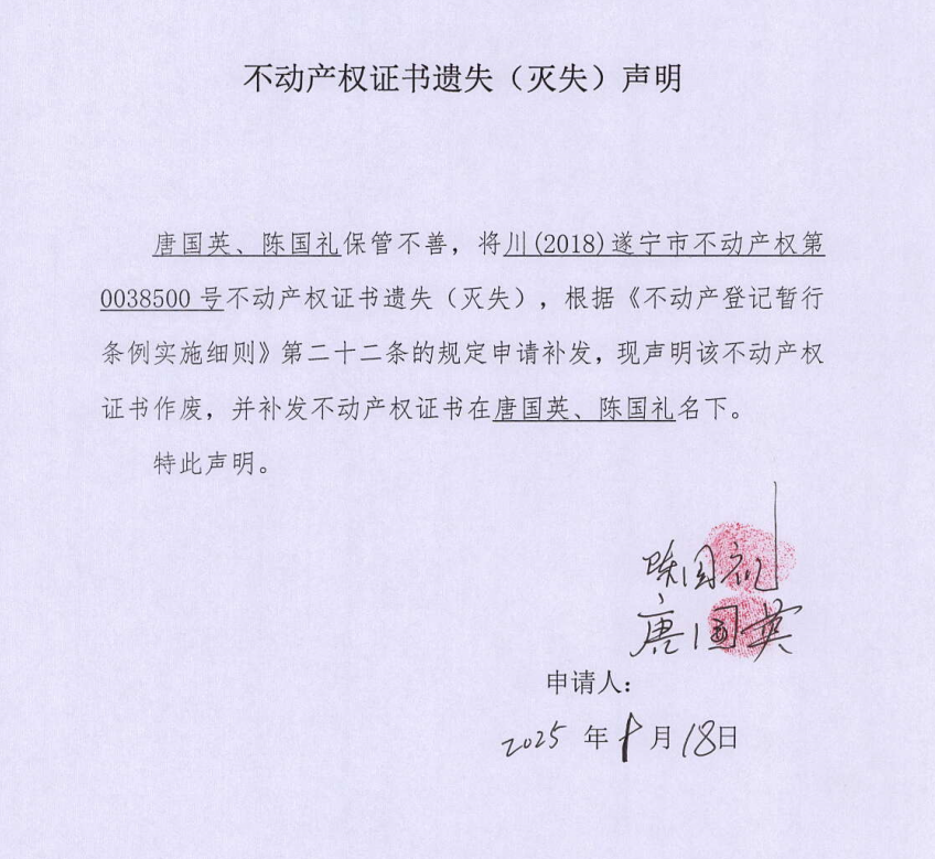 不动产权证书遗失(灭失)声明(唐国英、陈国礼)