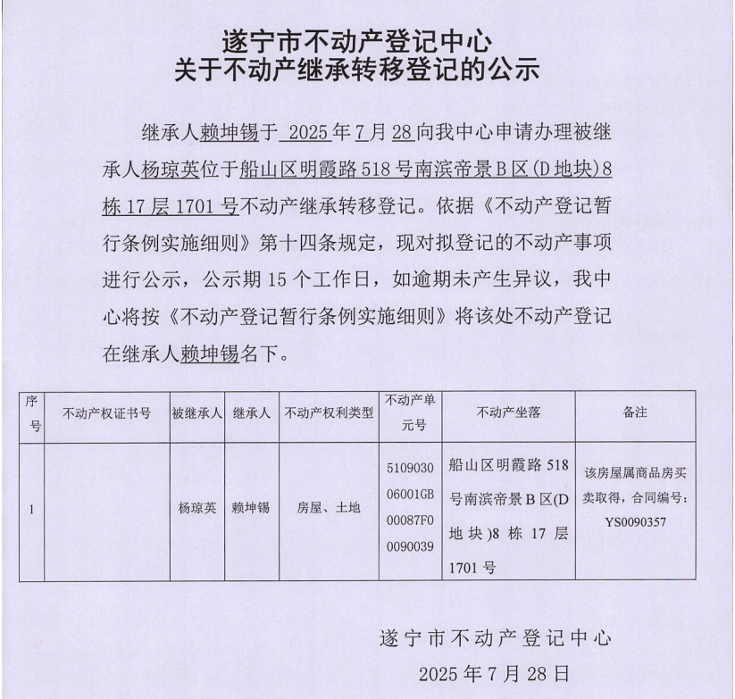 遂宁市不动产登记中心关于不动产继承转移登记的公示(赖坤锡)