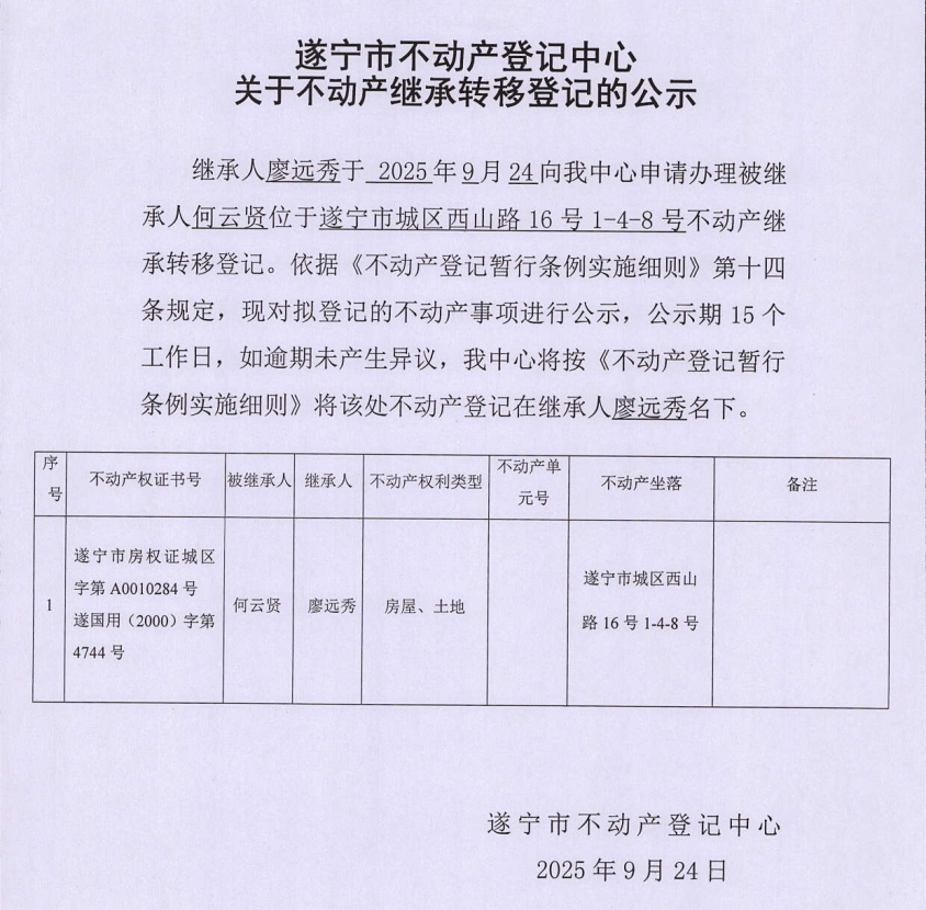 遂宁市不动产登记中心关于不动产继承转移登记的公示(廖远秀)