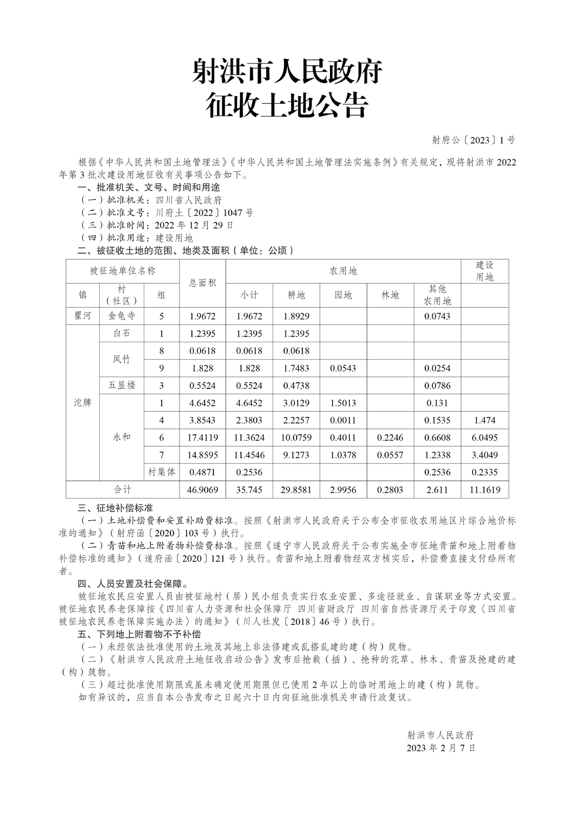 射洪市人民政府征收土地公告(射府公〔2023〕1号)