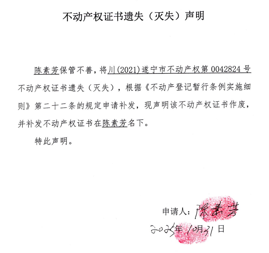 不动产权证书遗失(灭失)声明(陈素芳)