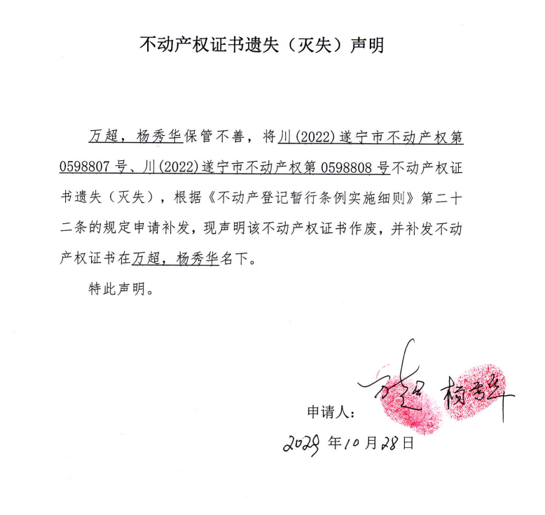不动产权证书遗失(灭失)声明(万超、杨秀华)