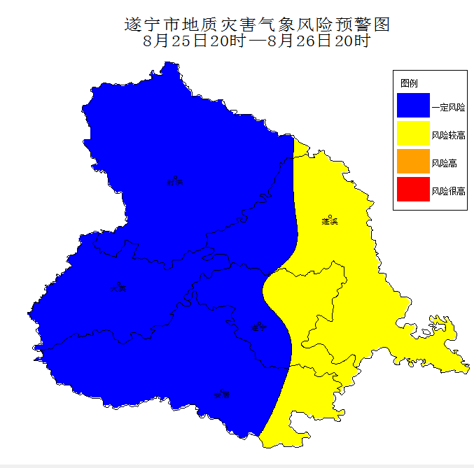 遂宁市自然资源和规划局与遂宁市气象局8月25日16时30分联合发布地质灾害气象风险黄色预警:预计今天晚上到明天白天,我市蓬溪县中部、南部,船山区中部、南部以及安居区东南部有大雨到暴雨天气过程,雨量40~70毫米,最大小时雨强20毫米左右,其余地区雨量10~30毫米。我市东南部地质灾害气象风险较高,请注意做好实时监测、防汛预警和转移避险等防范工作。