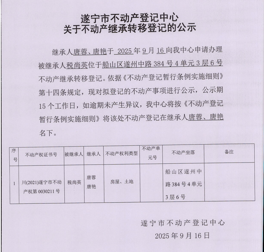 遂宁市不动产登记中心关于不动产继承转移登记的公示(唐蓉、唐艳)