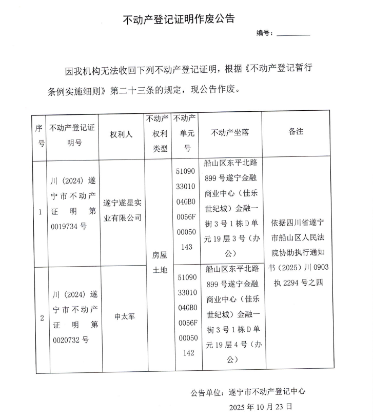 不动产登记证明作废公告(遂宁遂星实业有限公司/申太军)
