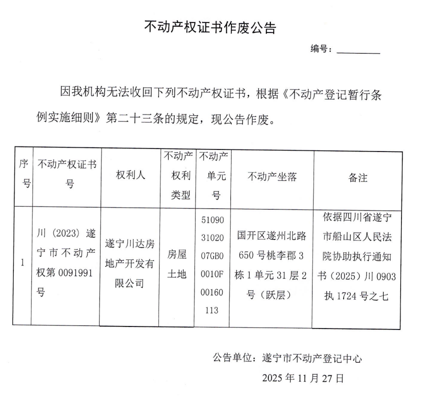 不动产权证书作废公告(遂宁川达房地产开发有限公司)