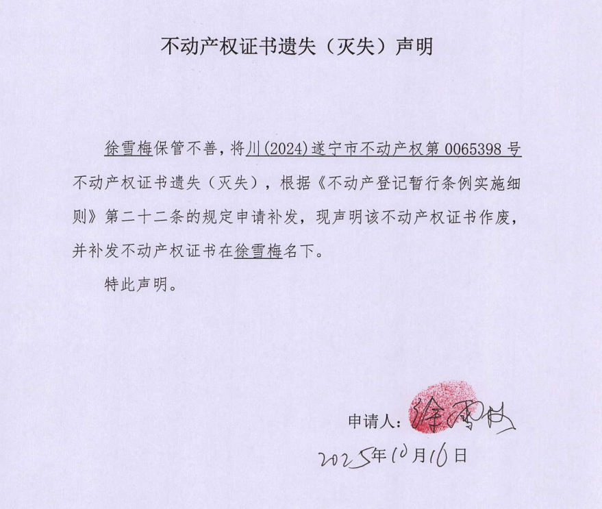 不动产权证书遗失(灭失)声明(徐雪梅)